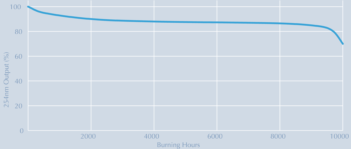 Lamp tube current 800mA High Output (HO) germicidal lamps yield 1/3 to 2/3 more UV output than standard output 425mA lamps of the same length. The ozone action germicidal lamps generate energy at 185nm in addition to the 253.7nm line.