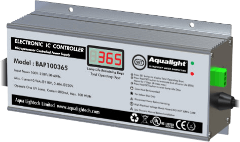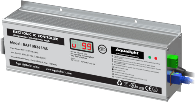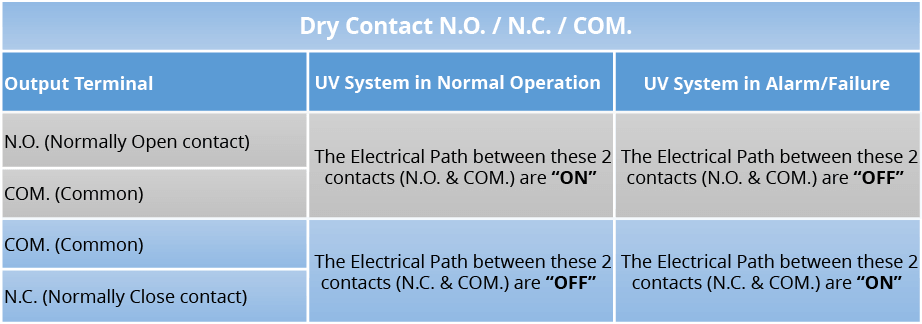 These dry contacts can be wired for a normally open (N.O.) or normally closed (N.C.) operation. The dry contacts will remain either closed (N.C.) or open (N.O.) until ultraviolet lamp in normal operation.